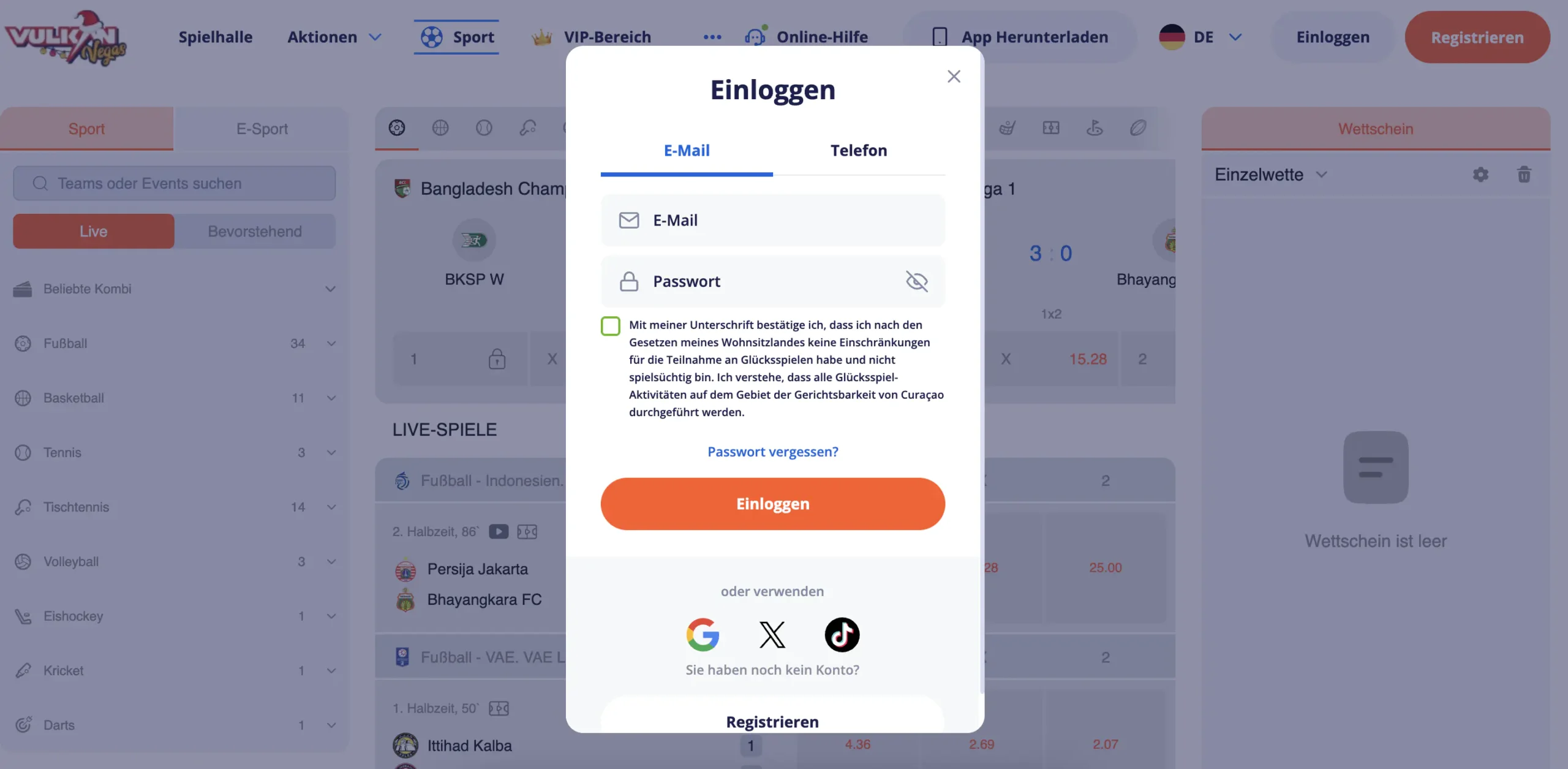 So platzieren wir eine Live-Wette bei Vulkan Vegas: