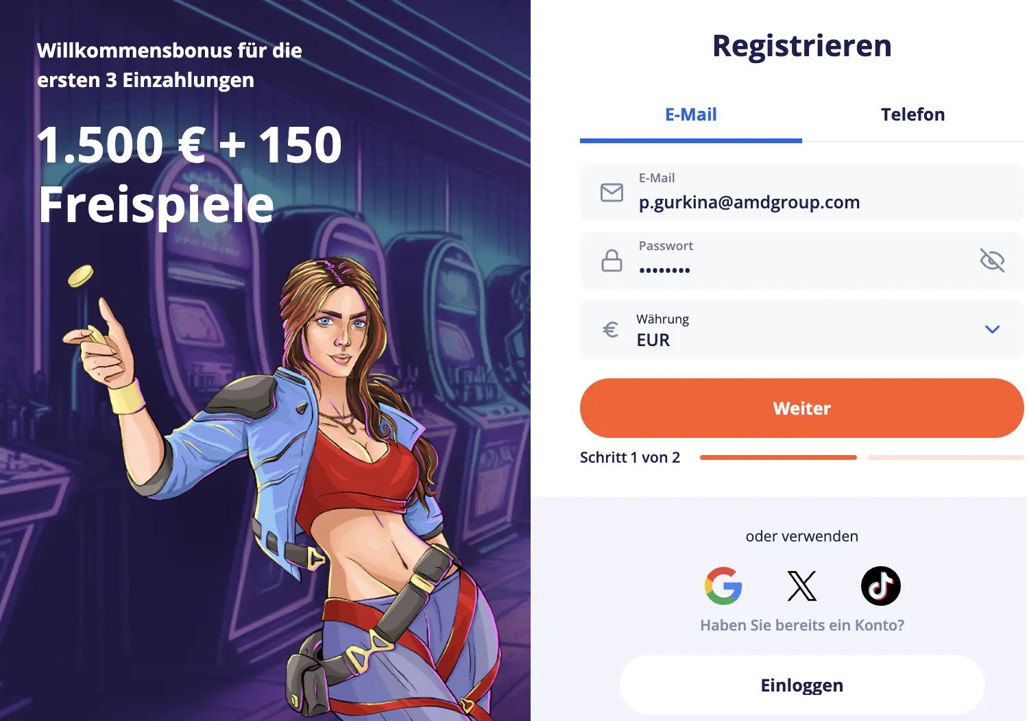 - E-Mail-Adresse und Passwort festlegen: Wir geben eine gültige E-Mail-Adresse ein und erstellen ein sicheres Passwort. Dieses benötigen wir später für die Anmeldung bei Vulkan Vegas deutsch.